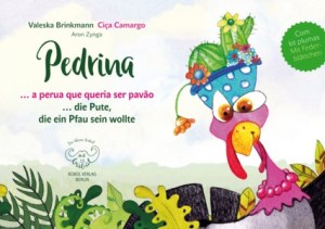 Es gibt Bücher, die wunderbar in kleine Hände passen, eins davon ist Pedrina – Die Pute, die ein Pfau sein wollte von Valeska Brinkmann und Ciça Camargo. Dieses zweisprachige Buch, geschrieben in brasilianischem Portugiesisch und dann ins Deutsche übersetzt, ist der erste Titel der Reihe Der kleine Bübül, aus dem Berliner Bübül Verlag.