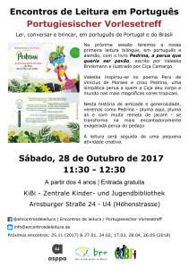 Pedrina – Die Pute, die ein Pfau sein wollte – a perua que queria ser pavão (€12.00) ist bei uns in der Buchhandlung oder auch online HIER erhältlich. Außerdem auch das Buch Arca de Noé (€35.00), das Vinicius de Moraes für Kinder geschrieben hat und in dem das Gedicht Peru HIER enthalten ist.
