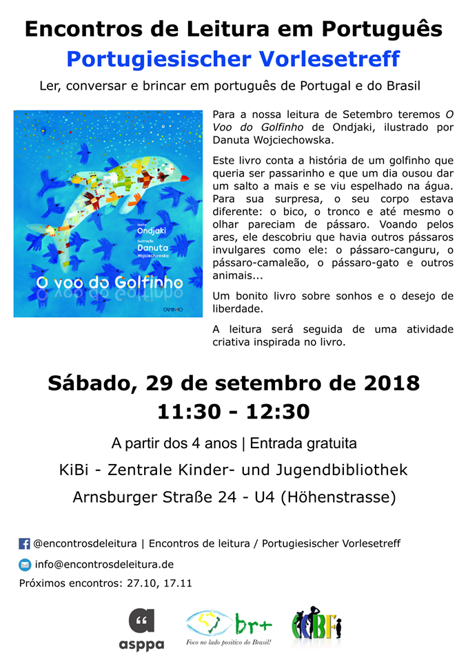 Das nächste Treffen des portugiesischsprachigen Vorlesetreffs findet am Samstag, dem 29.September um 11.30 Uhr in der Kinder-und Jugendbibliothek in Frankfurt-Bornheim, Arnsburger Straße 24 statt. Im Mittelpunkt steht dann das Buch O Voo do Golfinho des angolanischen Autors Ondjaki. Der Eintritt ist frei.