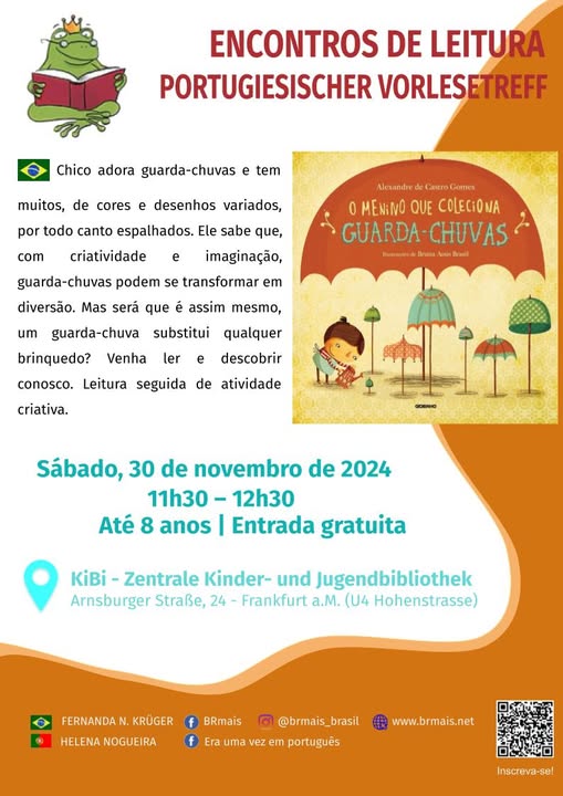Der portugiesische Vorlesetreff für Kinder trifft sich wieder am 30. November um 11.30 Uhr in der Kinder-und Jugendbibliothek in Frankfurt-Bornheim, Arnsburger Straße 24 statt.
